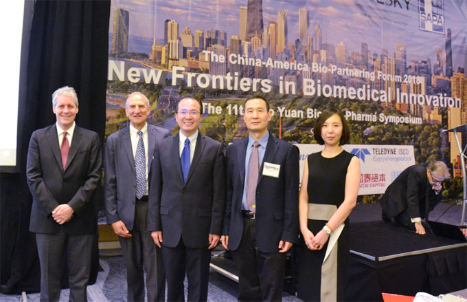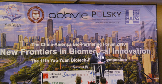 本次活动是由药源、艾伯维、芝加哥大学Polsky企业创新中心、美中药协联合主办。中国驻芝加哥总领事馆洪磊总领事,广东省顺德市长彭聪恩出席并致辞。中美生物医药投资对接论坛暨第十一届药源生物制药研讨会主席、CSU风险资本公司副总裁泰瑞奥本诺斯博士(Terry Opgenorth)在开幕致辞上指出,芝加哥及美中地区拥有众多杰出的生物制药科研机构、众多知名制药及医疗设备企业,但是与东西海岸相比,美中地区的生物制药领域的风险投资项目发展却不充分。首次举办的中美生物医药投资对接论坛,以“生物制药创新科技前沿”为主题,旨在促进中美双边生物制药科研机构与投资方的交流与合作,希望中美生物医药投资对接论坛成为双边优秀生物制药项目的融资平台。