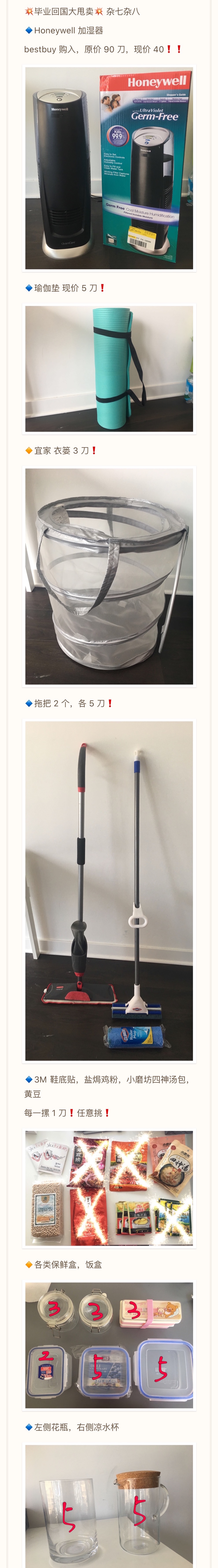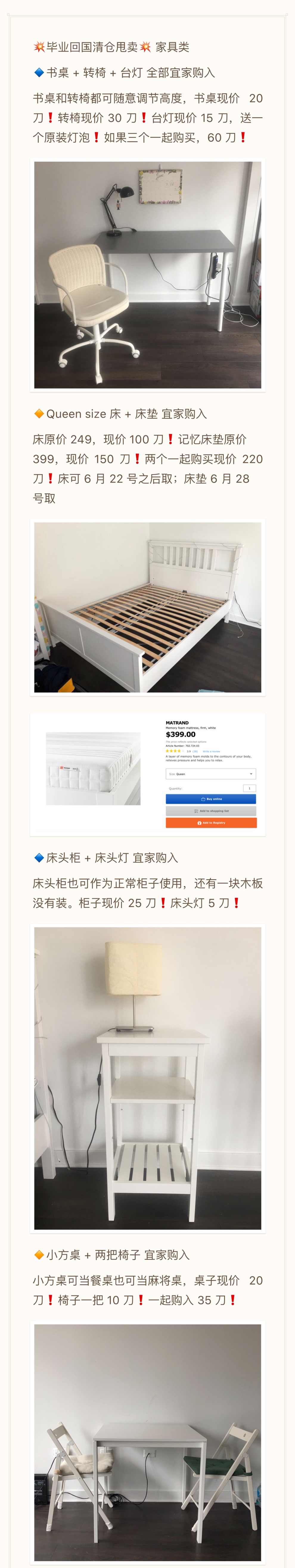 毕业回国卖东西啦❗️最后两天,清仓大甩卖!现有家具(queen size 床,99新床垫,旋转升降椅子,插线板,电热水壶,电饭煲,变压器,养生壶,各式收纳盒收纳袋,鞋架,衣篓,保鲜盒,花瓶,电子剃头刀,塑料椅,等等。价格看大图,详情请发短信至312 9536610,或加微信DengDic联系。