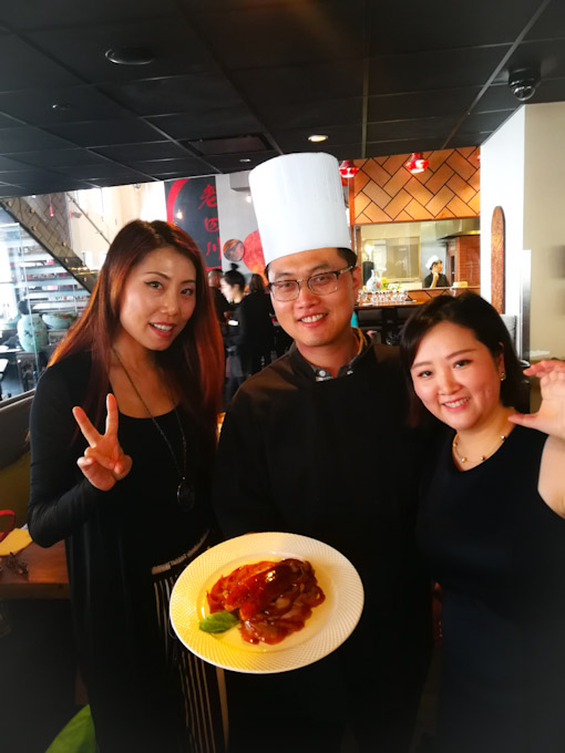 Chicago Girls Time创始人jenny Jia(左)与Lady One手工美食坊创立人Elaine Wang(右)和老四川烤鸭师傅田军合影
