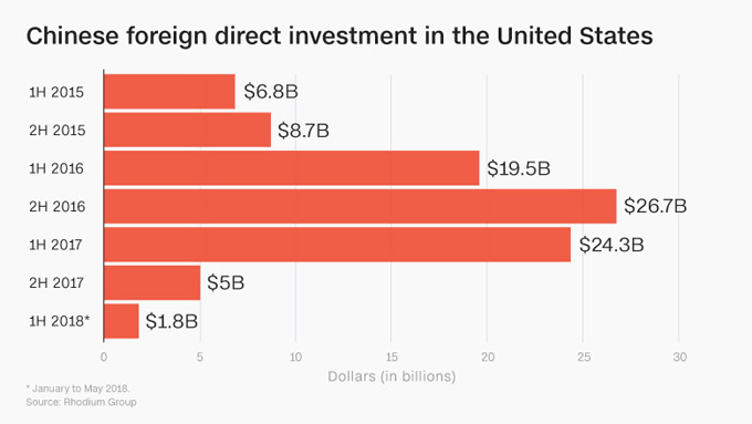 芝加哥侨学网编译】2018年头五个月,中国对美投资总额仅为18亿美元,与去年同期相比可谓悬崖式跌落,降幅高达92%,是过去七年以来最低记录。川普总统发起的对话贸易战,中国政府对中国企业海外投资收紧管控,让中国对美投资骤然进入寒冬。