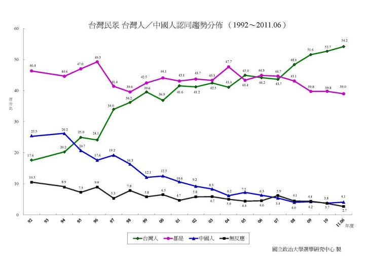 台湾陆委会委托台湾国立政治大学选局研究中心调查台湾人民自我认同研究,计画已经持续了近20年,是台湾针对同一议题不同时间的民意调查最具权威的一份资料,根据这张由调研结果绘制的图表透漏了惊人的变化,从1992年起∶『认为我只是中国人的台湾人民,已经从1992年的25.5%下降到2011年4.1%,剩下不到原来的五分之一。认为我只是台湾人的台湾人民从1992年的27.6%,上升到2011年的54.2%,比率成长了三倍,认为自己仅是台湾人的台湾人民,已经超过台湾人口比率的一半。而我是台湾人也是中国人的比率也在逐渐减少中。』