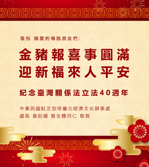值此农历乙亥猪年新春来临之际,我谨代表中华人民共和国驻芝加哥总领事馆,并以我个人名义,给领区广大华侨华人、中资机构人员和留学生拜年,衷心祝愿大家猪年生活美满,事业圆满!