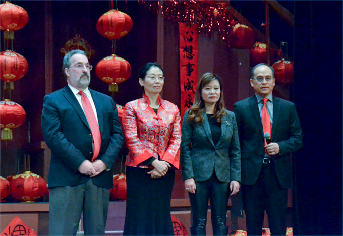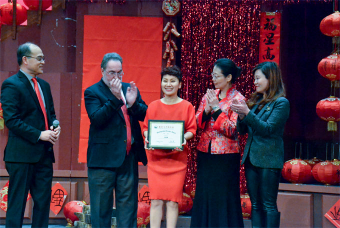 希林北郊中文学校校长黄秀明(Lisa Huang)代表校方感谢该校学生家长们、湖林高中的小留学生们为本次活动担任义工,从筹备节目、舞台装点到演出现场,大家都为社区公益默默奉献。黄校长还感谢叶青舞蹈团、飞鹰功夫学院以及晚会赞助商对新春联欢暨十五周年庆典的大力支持。
