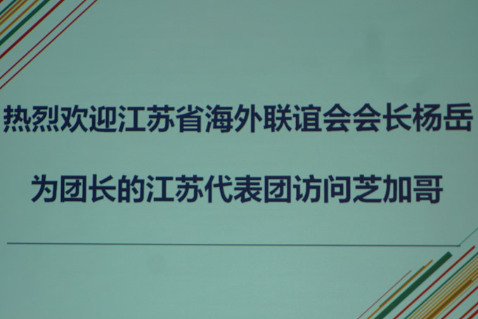 芝加哥当地江苏老乡接待江苏代表团做了欢迎字样的大屏幕