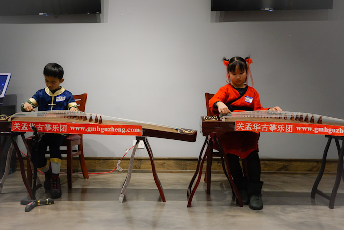 自于关孟华古筝工作室的金童玉女暄萌组合表演了关孟华老师改编的古筝重奏曲《中外名曲联奏》