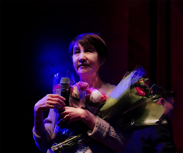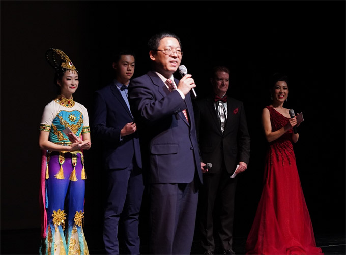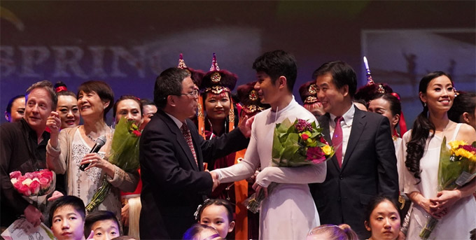 中间位置手捧鲜花正在接受领事赞美的白衣帅哥:皓舞舞蹈团创始人 – 吕皓