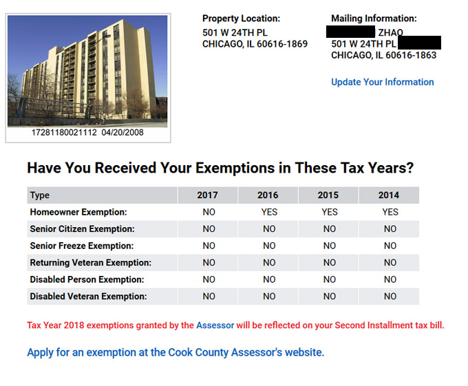 https://www.cookcountytreasurer.com)。屋主输入房屋的17位数字的编号或者房屋地址,即可获得近年来的房产税税单情况,包括近年来是否享受了相关的房产税豁免。
