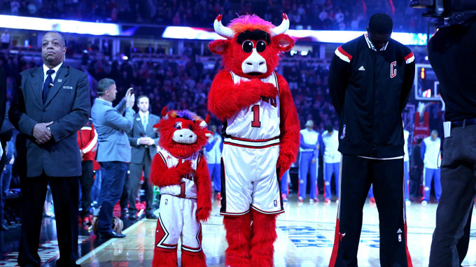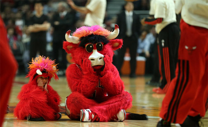 2015年4月,芝加哥公牛队对底特律活塞队赛事上,本尼牛携“牛娃”登场