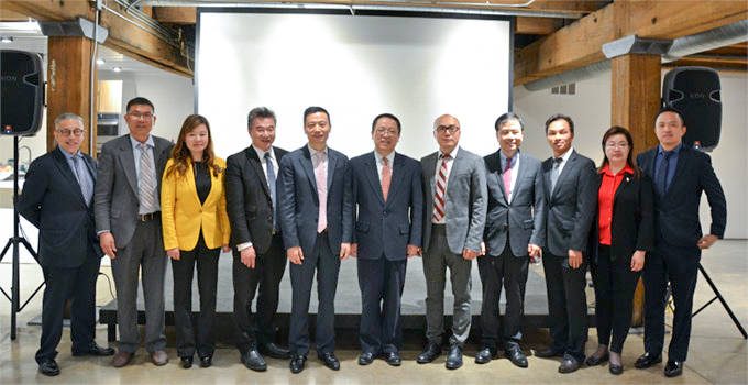 美国中餐学会职员与黄黎明副总领事(中)、卢晓晖领事(右四)、华联会主席郑征(左三)合影留念