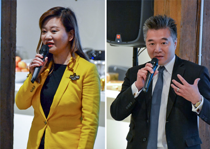 香港华协会会长梅小平(左)、美亚协会会长梁安致辞