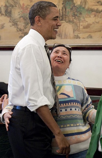 奥巴马周四在旧金山中餐厅与亚裔女子合照。翻摄网路