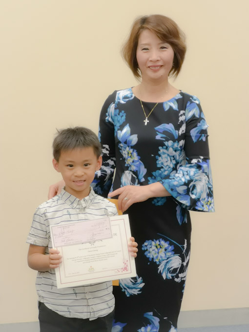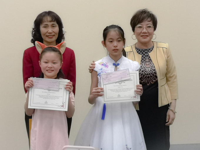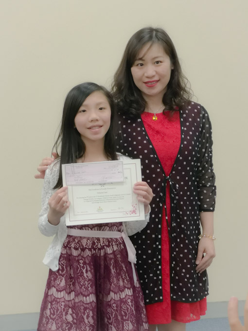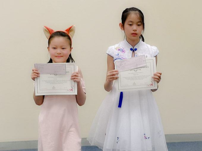 第一名的绘画作品来自于希林西北中文学校的8岁女孩窦菲(左)