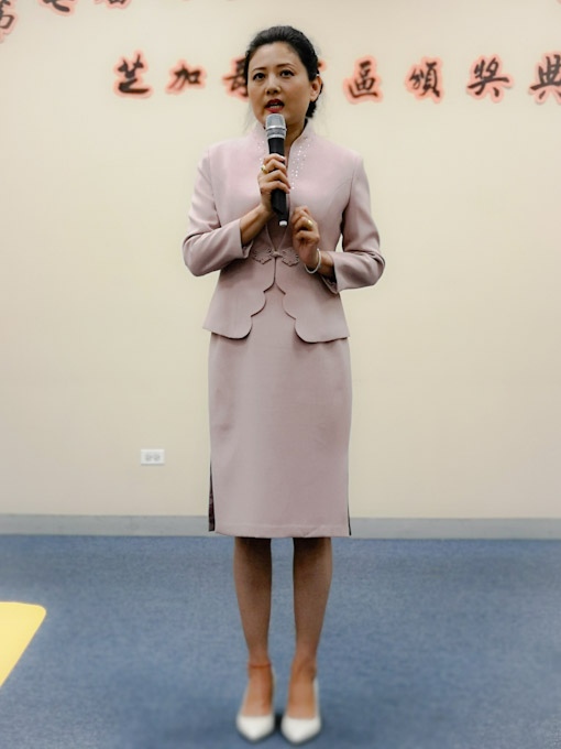 芝北中文中心满素洁校长2018年9月跟北京侨联签约,负责芝加哥分会场的大赛赛事。大赛一共收集了一百幅作品,经过评委认真细致的评选,评出了17幅一、二、三等奖作品和一批优秀奖作品。满校长在致辞中说:“当我跟北京侨联签约时,我是那样的大胆和无畏,因为承办这样的比赛,没有钱力和人力是不行的。今天我们颁奖典礼能够顺利地举行,我要感谢我们今天到场和没有到场的,默默无闻、埋头苦干的评委们,感谢他们在我们没有一分钱的资助下,答应我们,实力为传播中华活动站台,我也感谢所有的赞助商们,是他们给了我们芝北中文中心举办这次大赛的豪气冲天的勇气,感谢远在中国的欧德顺先生担任这次大赛芝加哥赛区的名誉顾问,感谢给予我们远程指导的大会名誉评委主席段昭南先生。我还要感谢我们所有的家长,感谢他们支持他们的孩子参与这样的活动,在孩子幼小的心灵里种下热爱中华文化的种子。感谢所有的指导老师,是他们在不断地指导孩子认识、理解和热爱中国文化。”