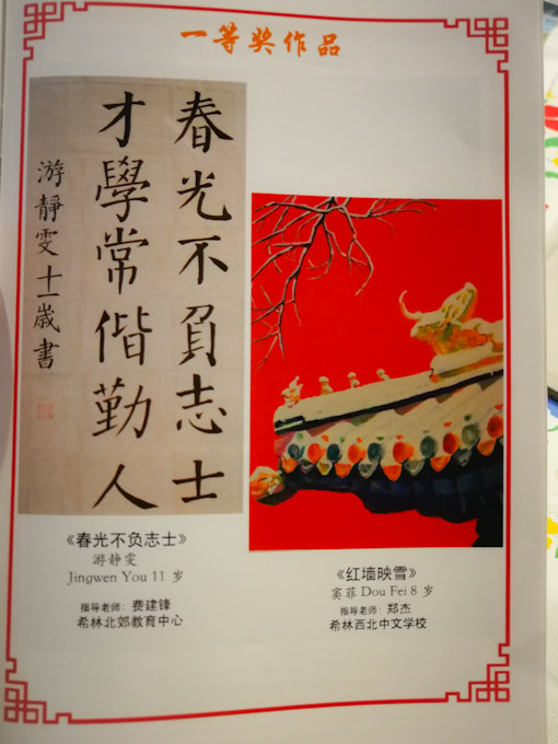 第一名的绘画作品来自于希林西北中文学校的8岁女孩窦菲,她的作品《红墙映雪》感受到和品尝到了雪落下的声音。