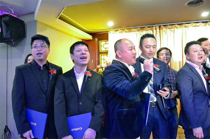 在中国侨联海外法律顾问王志东律师见证下,郑时坦会长,常务副会长黄宝章、黄晖、陈明锋,副会长刘金仁、马捷鹏、柳星,理事长郑东旭,荣誉会长倪举凌、林建新、陈健明等第三届职员正式宣誓就职。