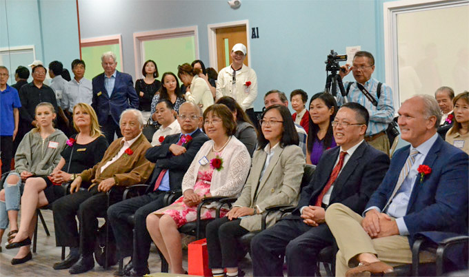 瑞柏市市长奇瑞科(Steve Chirico),中国驻芝加哥总领事馆黄黎明副总领事、周蕾领事,伊州州务卿亚裔顾问委员会主席马森柱,芝加哥福建商会会长郑时坦,美中亚裔健康协会主任刘红博士等各界嘉宾莅临,全新的希林亚裔社区中心剪彩。