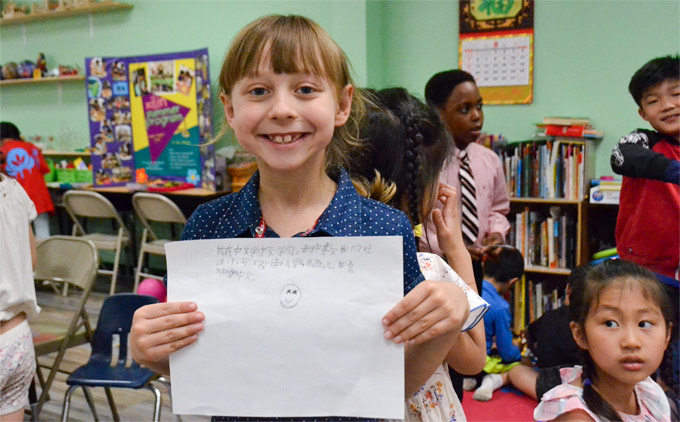 希林中心致力于推动社区中文教育,图为希留念中文学校的俄罗斯裔小朋友展示自己的中文默写