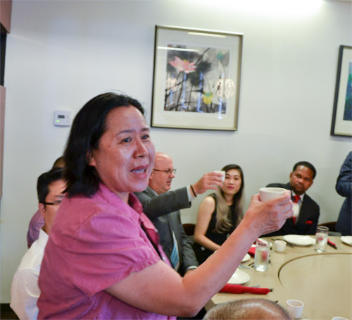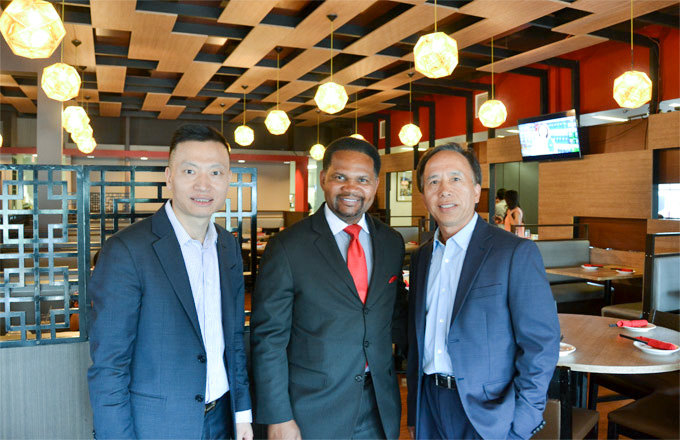 奥罗拉理查德市长(左)莅临道贺,右为美国老四川餐饮集团创始人、美国中餐学会主席胡晓军