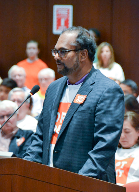 瑞柏华人社区反大麻店委员会总指挥、西郊203学区委员会梁保罗(Paul Leong) 在市议会上陈词