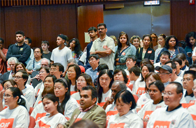 出席市议会会议的各族裔民众,右二为瑞柏华人社区反大麻委员会成员盛晓玲