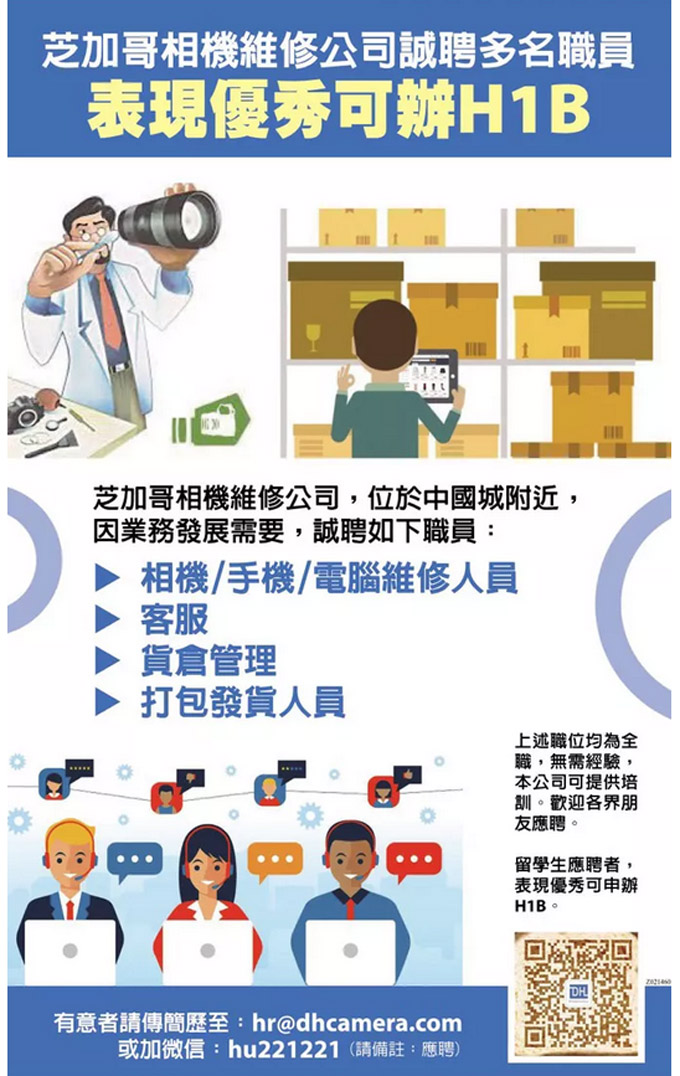 芝加哥相机维修公司DHcamera,位于中国城附近,因业务发展需要,海量招聘中!