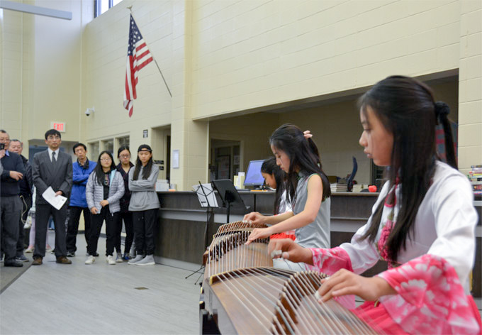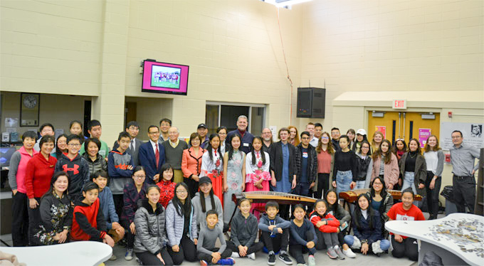 表演古筝的瑞华中文学校学生与主办方代表合影