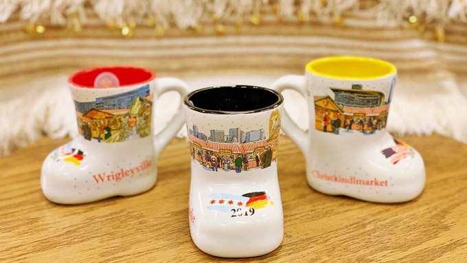 德国圣诞市场的一大标志礼物,就是它的主题马克杯。由于每年的设计和风格各异,因此每年的马克杯成为了人们争相收藏的宠儿。今年的设计已经公布,马克杯外形重归经典的靴子形设计,图案展示三个不同德国圣诞市场举办地的盛况。