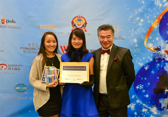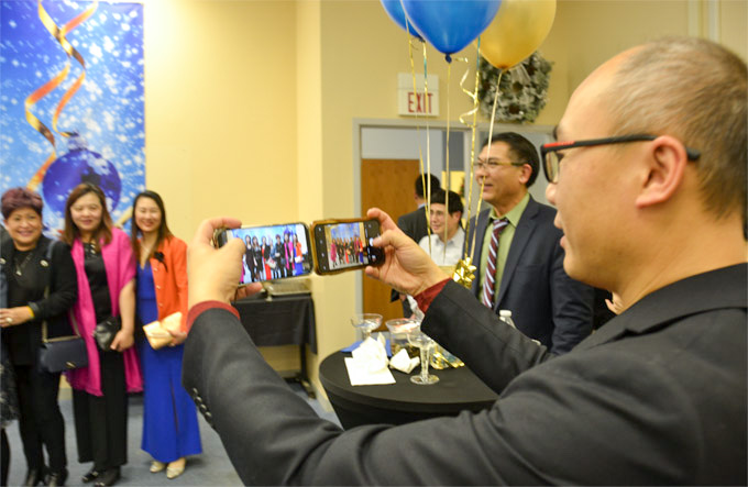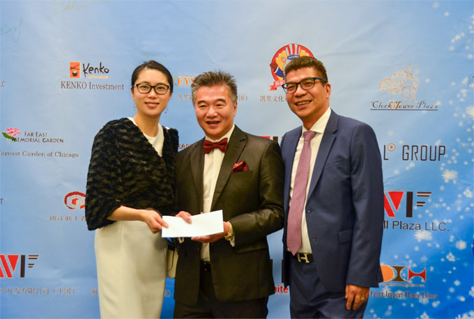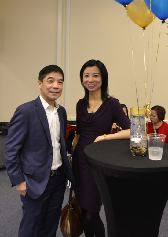 各界来宾莅临年会,左为餐饮业主Vincent Zhan,右为芝加哥中文学校校长徐婕雯