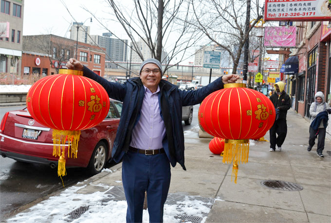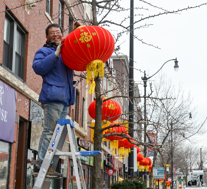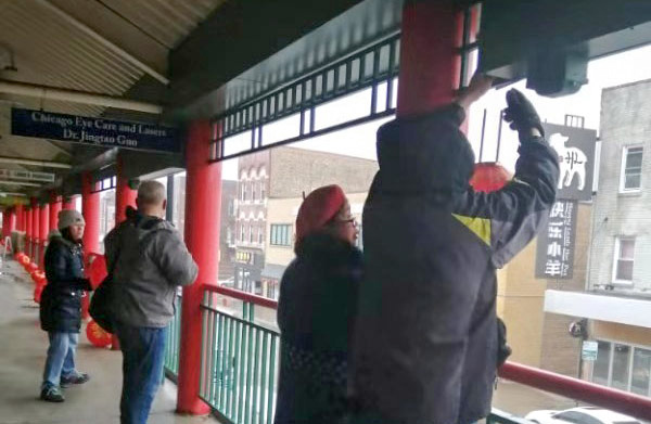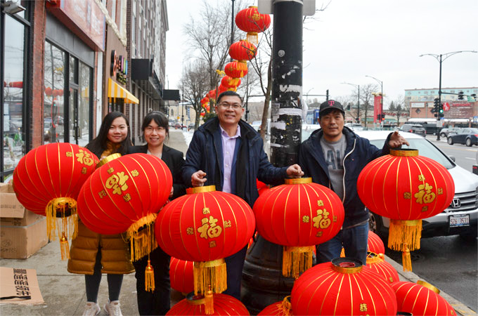 1月11日到1月14日,芝加哥广州协会、福建商会在华埠广场、永活街(Wentworth Ave)、舍麦路(Cermak)沿线这些中国城的核心商界区域,挂起了1000多个大红灯笼,在新春佳节扮靓华人社区。挂灯笼的义工志愿者们,得到了沿线商家业主的支持,街坊邻居的赞许,众多行人拿出手机,拍下大红灯笼的吉祥喜庆。