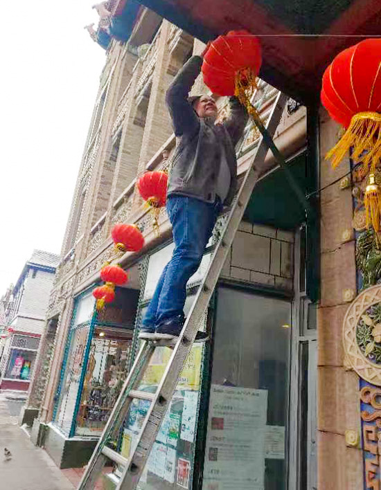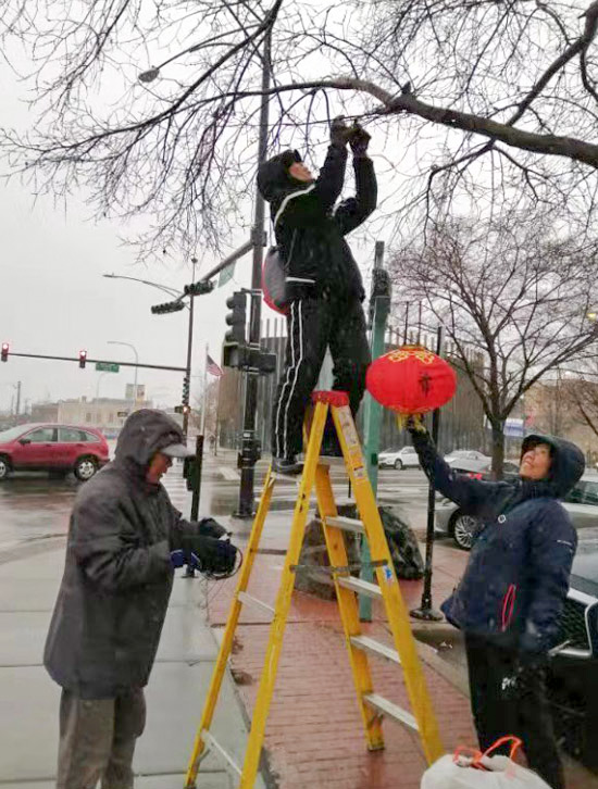 国庆期间挂五星红旗,春节期间挂灯笼,这是芝加哥广州协会多年来的优秀传统。鼠年新春将至,广州协会在永活街沿线、华埠广场周边挂起了大红灯笼。1月11日当天芝加哥雨雪交接,广州协会的乡亲们却是热情高涨,冒着风雪挂灯笼,为新春之际中国城带来节日风景线。