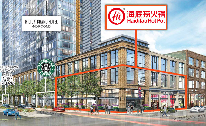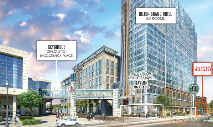 海底捞所在的大楼是全新建筑,实际上是麦科米克会展中心希尔顿酒店开发工程的一部分,开发商是著名的SIERRA US公司。同心地产公司总裁梁式华表示,海底捞集团高层2017年年底就来芝加哥考察,首站中国城区域的考察并没有找到令人满意的选择,最终在两三个街区以外的区域找到了如今的选址。2018年海底捞集团正式与大楼业主签约,2019年进入装修阶段。