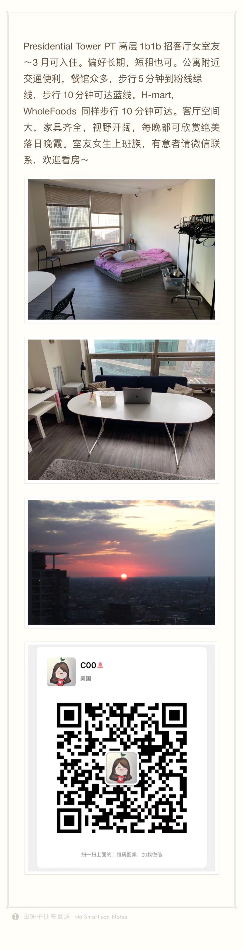 West Loop Presidential Tower公寓 1b1b 招客厅女室友