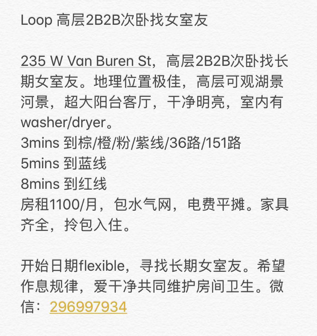 开始日期flexible,寻找长期女室友。希望作息规律,爱干净共同维护房间卫生。微信:296997934