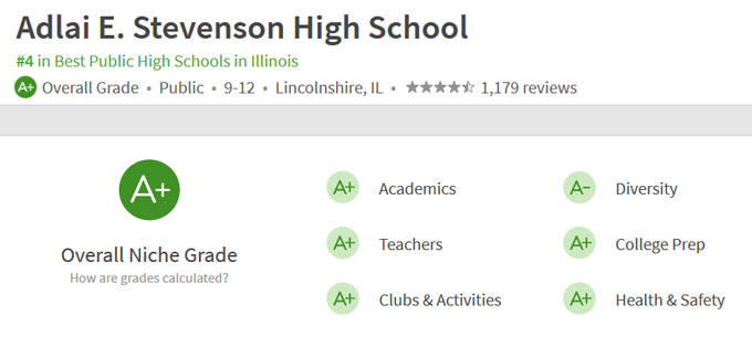 Lincolnshire, IL 60069阿德莱史蒂文森高中(Adlai E Stevenson High School),芝加哥北郊优秀公立高中。2017年曾入选Niche评定的“全美最佳公立高中”第一名,多年来位居《美国新闻与世界报道》伊州最佳公立高中前十强,在全美科技工程数学领域位列全美前茅。在《美国新闻与世界报道》2020年“全美最佳公立高中”排名中,斯蒂文森排名全美第150名,伊州排名第六。