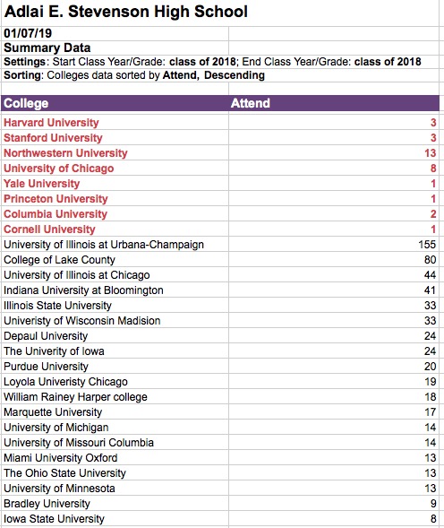 2019年史蒂文森高中众多毕业生进入名校就读斯蒂文森高中1965年成立,是伊州第一个获得联邦政府教育部“蓝丝带”(Blue Ribbon Awards)荣誉的公立高中(1987, 1991, 1998 and 2002)。在全美国,四次荣获教育部“蓝丝带”荣誉的公立高中仅有三所,而斯蒂文森高中就是其中之一。《美国新闻与世界报道》、Newsweek, 《华盛顿邮报》的全美“公开入学”优秀公立高中评选中名列前茅。与需要凭入学考试成绩才能进入的重点高中不同,“公开入学”即为学区房的核心概念,只要学生家庭住址在学区范围内,即可就读。