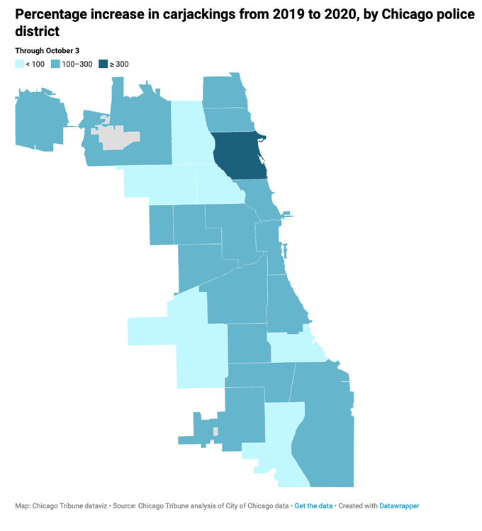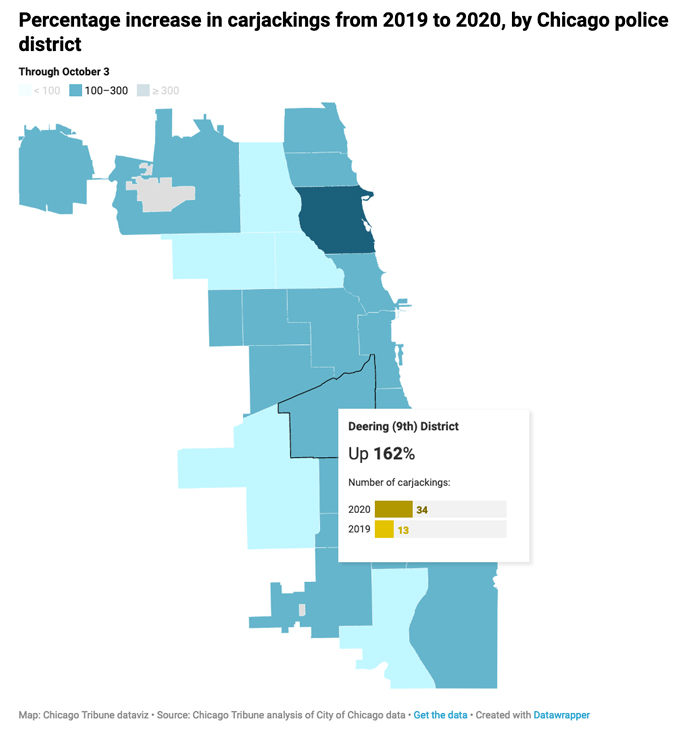 芝加哥警察局探员主任迪尼翰(Brendan Deenihan)指出,今年一月至四月份的劫车案数量已经比去年同期增加了64%。随着2020年的推进,增幅在不断地升高。他表示,尤其是芝加哥经历了两场“打砸抢”暴乱后,从6月份开始,情况出现失控。