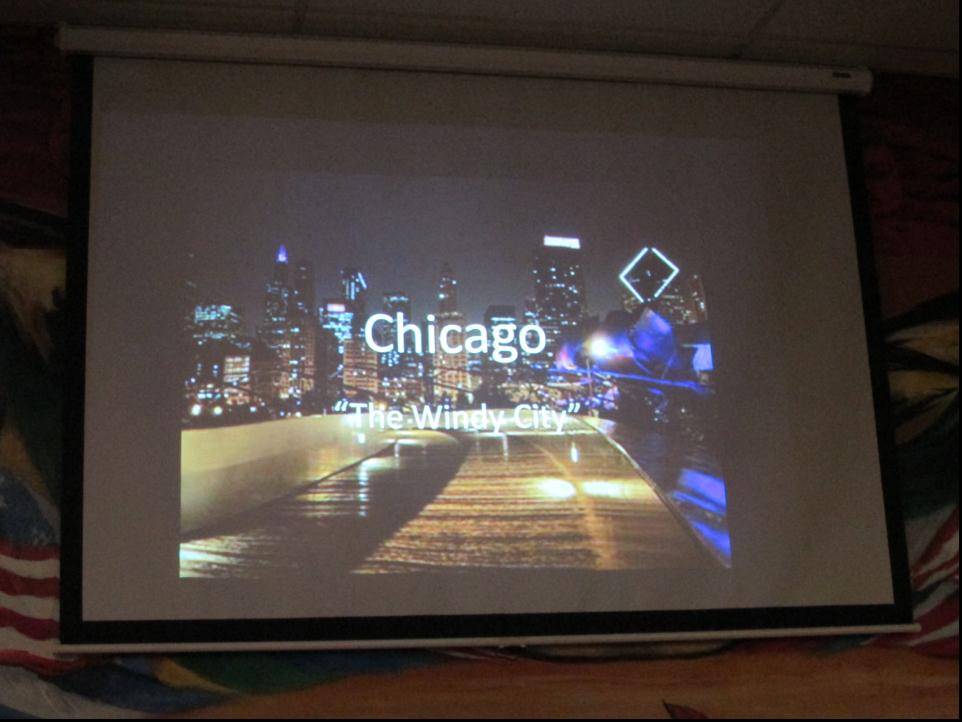 2012-8-31 近20名来自中国,美国,俄国,意大利,埃及,印度,墨西哥,韩国的学子参加了由International Club举办的名为“风城芝加哥”的演讲,演讲者是一位墨西哥裔美国卷发美女 。