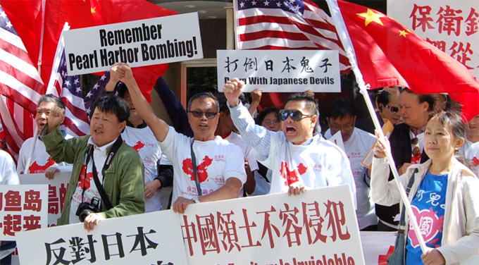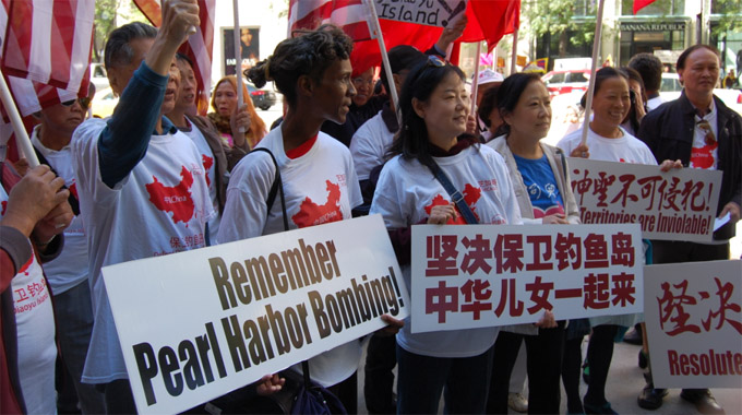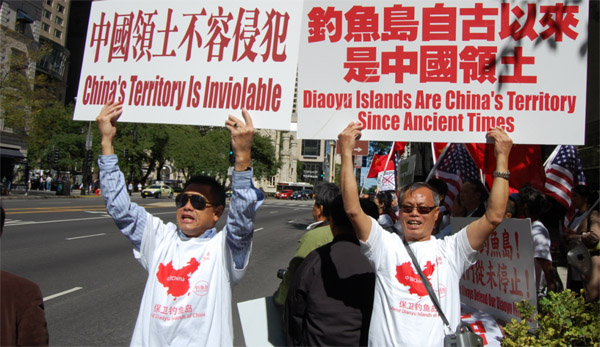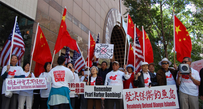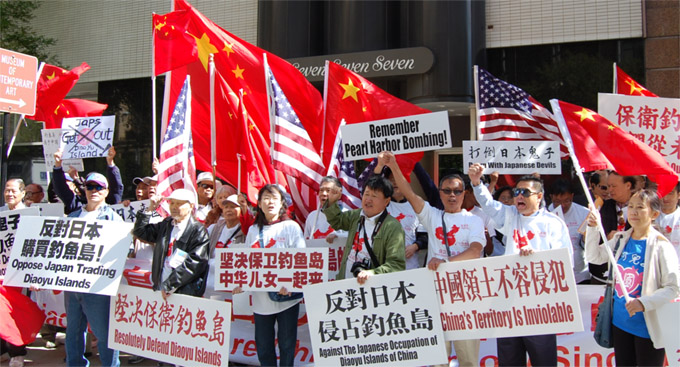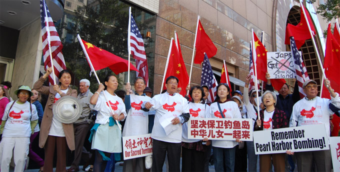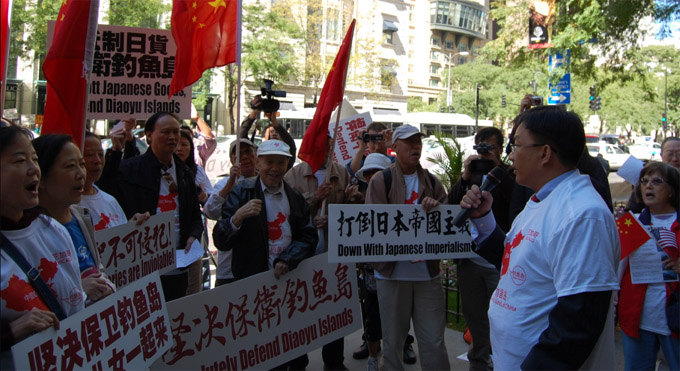 当天上午11时之后,来自中国城地区的各界侨领、示威民众在进入日本领事馆的大楼门前聚集,大家打出中美两国国旗,手举中英文双语抗议牌,高呼“钓鱼岛属于中国”、“日本滚出钓鱼岛”、“领土神圣不可侵犯”等口号,群情激昂。