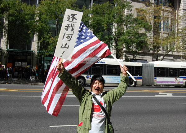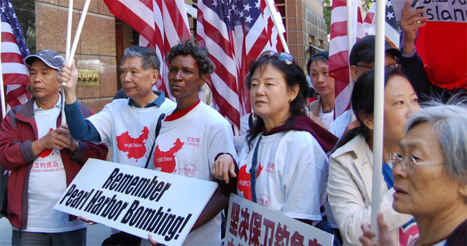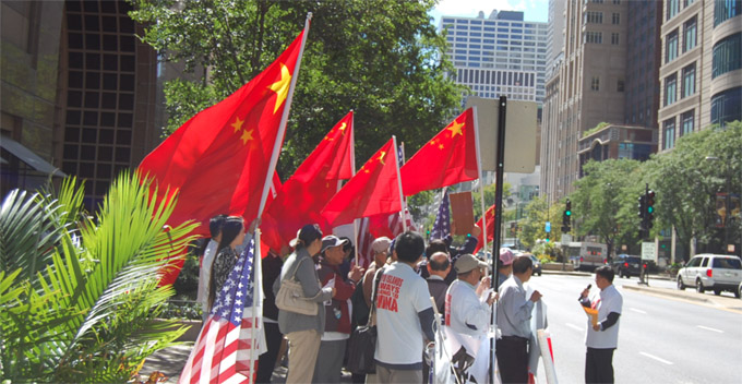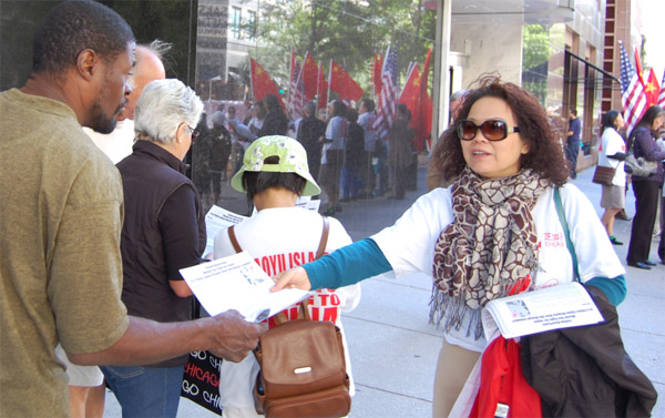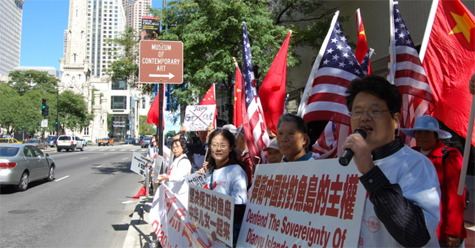 芝加哥五邑同乡会暨美国海外华人交流协会的代表方燕辉、方云江,美中保钓委员会召集人胡大江,美中抗战史实维护会会长梅国炘等侨领,在示威现场摇旗振威,高呼口号。华中科技大学校友会会长李红卫等很多在芝加哥市中心上班的华裔专业人士,也陆续前来加入示威队伍,壮大声威。