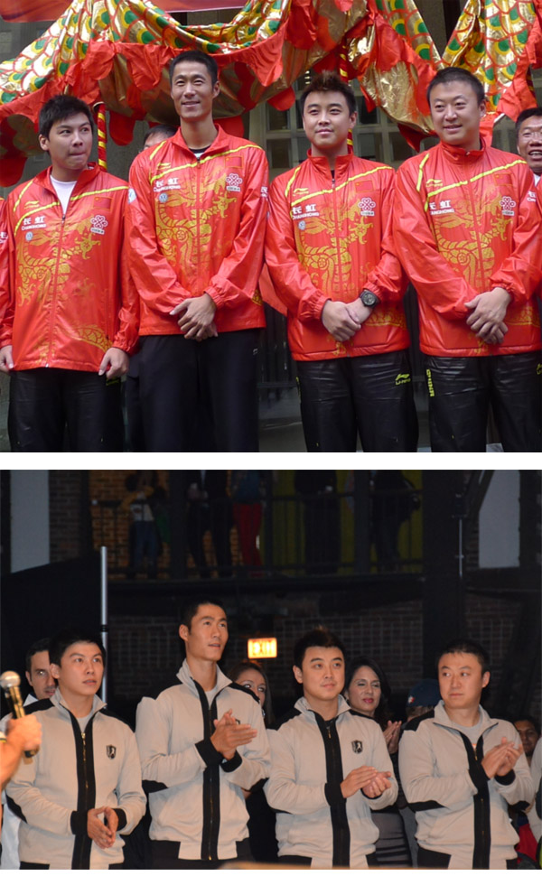 9月27日,中国乒乓球代表团队访问芝加哥。27日中午时分,芝加哥市中心举行庆祝中国63周年国庆升旗典礼,王励勤,王浩,马琳,丁宁等乒乓国手也参加,穿的该是中国国家乒乓球队队服。27日晚,芝加哥国际乒乓球节开幕,中国乒乓球代表团穿的是美方提供的统一服装。
