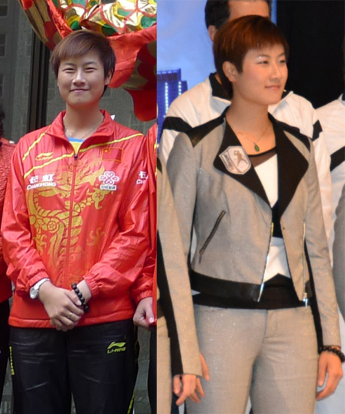 前后两场活动,中国乒坛的奥运冠军们,所站的次序一模一样,都是左起: