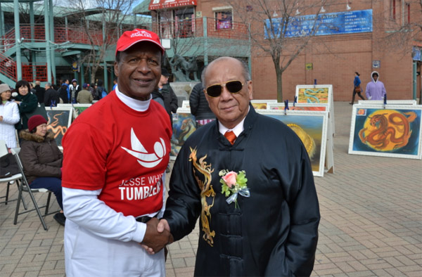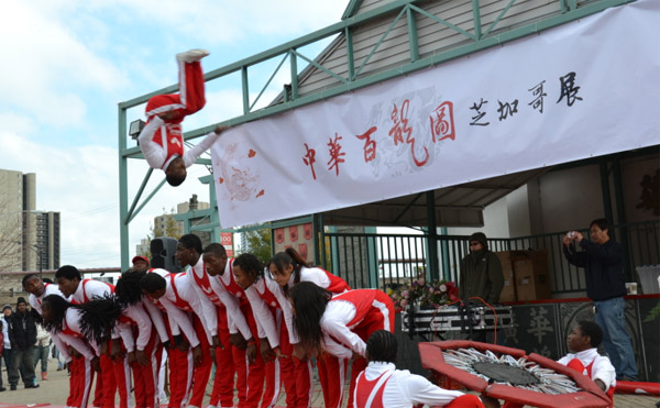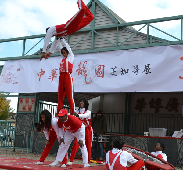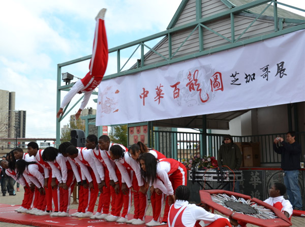 本次展出活动,是由美中康体文娱联会和二十一世纪中美有限公司联合主办,芝加哥中文学校及华咨询处松年中心协办,伊州州务卿杰西怀特亲自率领“杰西怀特跟斗队”(Jesse White Tumbling Team),前来为开幕式表演助兴。