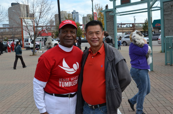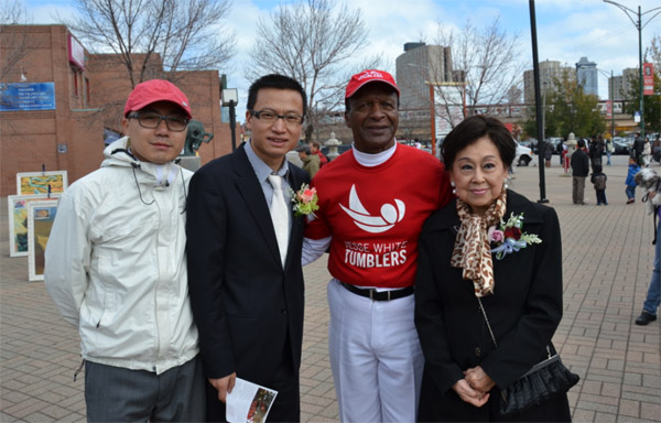 伊州州务卿Jesse White (中) 莅临剪裁现场,还特别率领著名的跟斗队前来表演助兴。