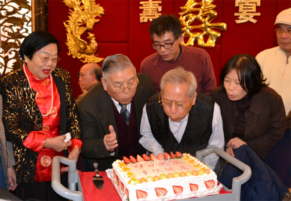 宴会高潮则是切生日蛋糕环节,关其炼、徐逢元等老侨领,当天可谓童心未泯,和到场的寿星们一起吹生日蜡烛,现场欢声笑语。特别值得一提的是,去年不幸中风的社区侨领黄显扬,当天在夫人李雅清的陪同下也前来赴会。黄显扬在中风后经精心治疗与家人贴心呵护,目前身体康复很快,气色俱佳,与会者无不为之感到高兴。