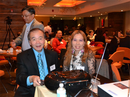 正在康复中的侨领颜弘二(左)坚持参加筹款餐会,并亲自担任晚会DJ, 精神可嘉