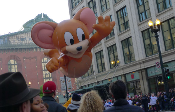 麥當勞叔叔乘著大紅靴經過時,小朋友都樂壞了,大氣球如超人狗狗,嘉菲肥貓,杜比狗,聖誕熊寶寶等搖搖擺擺出現在人們的眼前時,均博得人們的歡叫和笑聲, 但今年獨缺少了象徵感恩節的“湯姆火雞”的高大身影,同時芝麻街的明星如大鳥,餅乾怪獸,愛摩等可愛的大氣球,都在今年的感恩節大遊行中缺席。