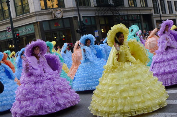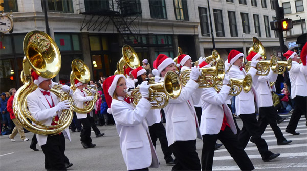 來自美國各地的銅樂隊和啦啦隊,沿途吹奏出充滿了聖誕佳節喜慶的樂曲,芝加哥的高空中瀰漫著過節的喜樂氣氛,30多輛花車,佈置的多姿多彩,各具特色;今年的馬隊也十分壯觀,有高頭大馬,有迷你小馬,還有不少可愛的小馬打扮成紅鼻子的麋鹿倫多夫,把大人和小孩都逗樂了,數十位打扮成美國南北戰爭年代的南方佳麗,穿著鮮豔的蓬蓬裙服飾走在州街上,吸引住民眾的眼光; 其他遊行隊伍還有星球大戰,夏威夷的草裙舞和火把舞,歐洲古代武士,千奇百怪的遊行隊伍,讓圍觀的民眾大呼過癮。