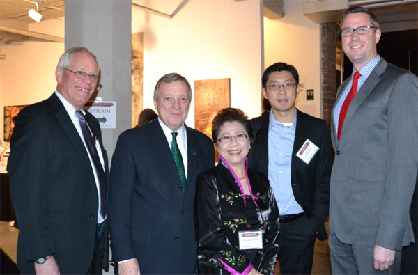 华咨处总裁黄罗瑞雄(中)与出席筹款晚宴的政要嘉宾合影,左二联邦参议员杜宾