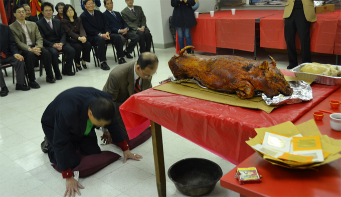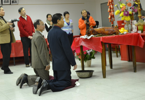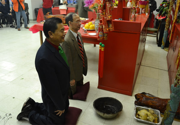 协胜公会两位新任主席,依照百年古礼,跪拜关公
