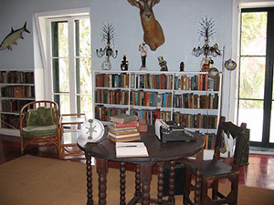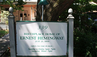 海明威家的这座小木楼是他外祖父霍尔1890年盖的。1899年7月21日,海明威出生于此。走进房子,地板不时嘎吱嘎吱作响。屋内格局是按照当年的原状进行复原的,大部分是海明威家族的遗物。在客厅,壁炉旁放着一张躺椅,桌上摆着几本书,屋角摆放着一架钢琴,客厅墙壁上挂着两幅风景画,是海明威母亲格蕾丝画的。格蕾丝喜欢艺术,在孩子们很小时她就教他们绘画和音乐。海明威自称在音律方面没有天分,却也能拉一手大提琴。
